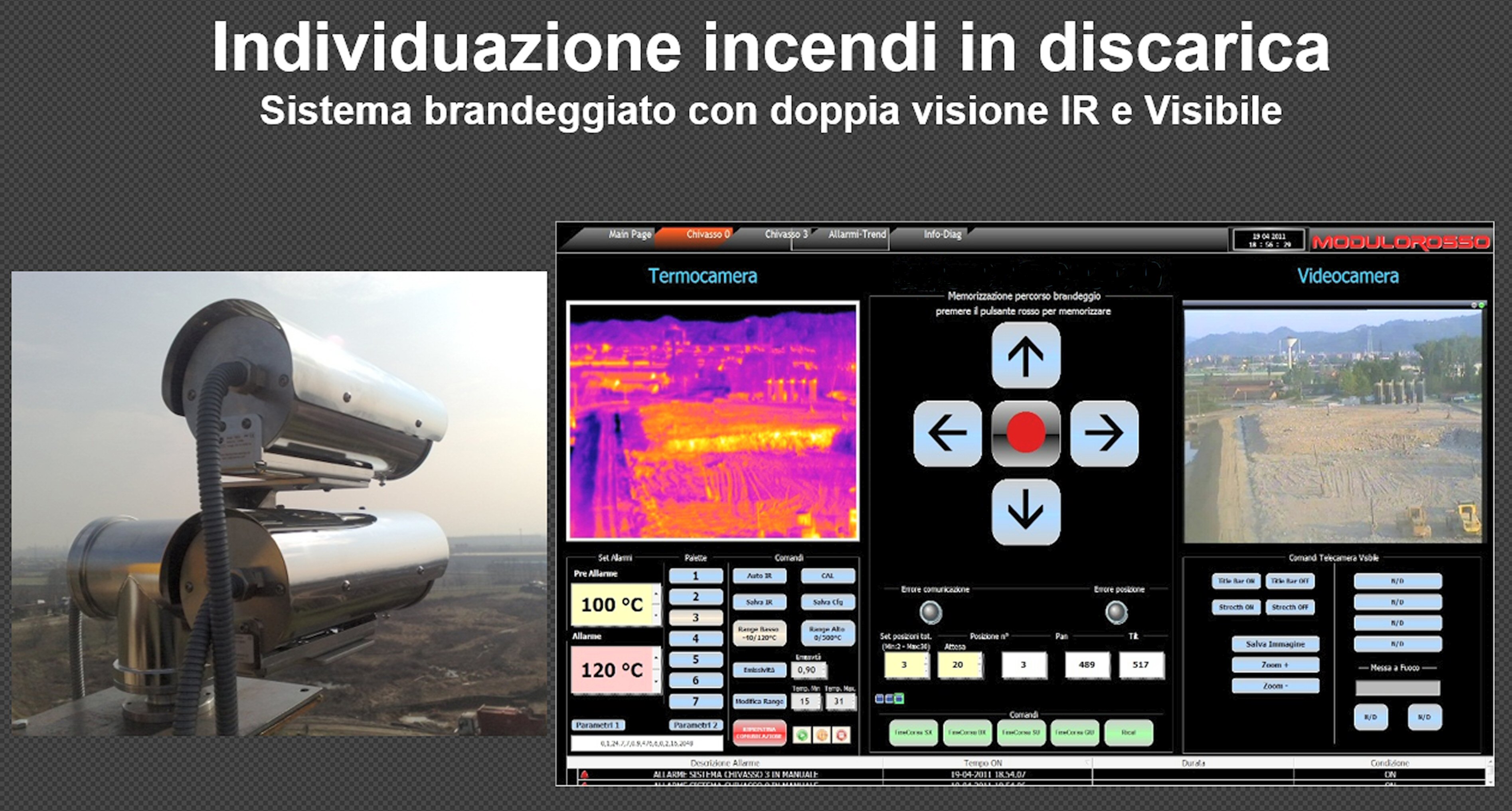 Per coprire l’intera area dei serbatoi, ogni serbatoio è monitorato da tre termocamere coprendo ognuna 120° della circonferenza. L’immagine termica ripresa dalle termocamere viene inviata mediante trasmissione Ethernet in sala controllo dove viene elaborata ed analizzata per controllo allarmi ed eventuale comunicazione con PLC/DCS di supervisione..